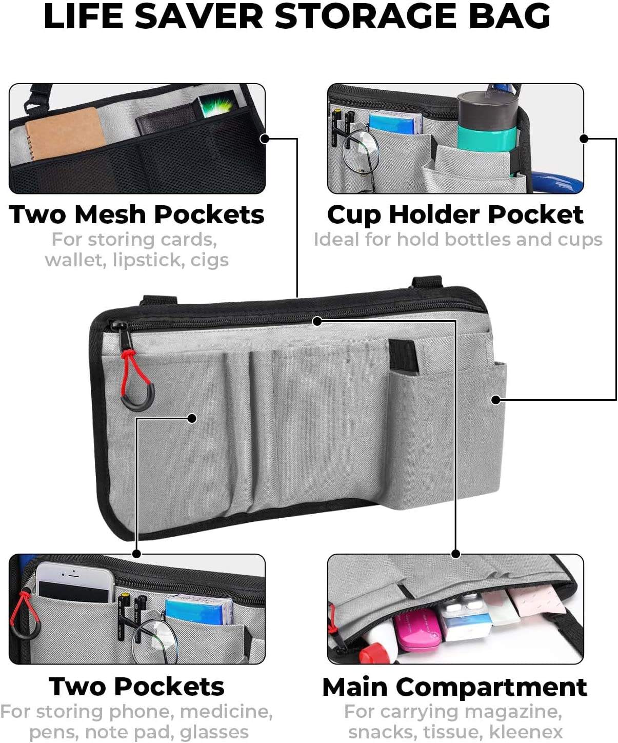 | Nome | Saco de armazenamento de andador portátil para cadeira de rodas saco lateral de mercearia bolsa organizadora de acessórios dobrável com porta-copos | ||||||