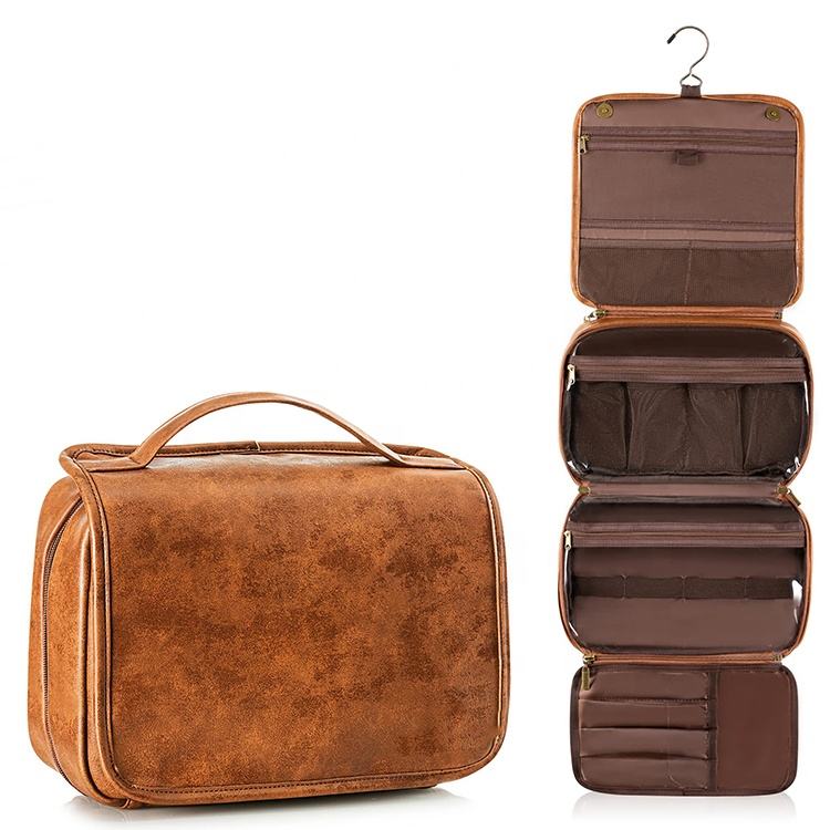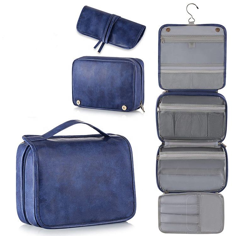 Gancho de pendurar de couro PU unissex dobrável bolsa organizadora de lavagem de produtos de higiene pessoal logotipo personalizado bolsa de cosméticos maquiagem