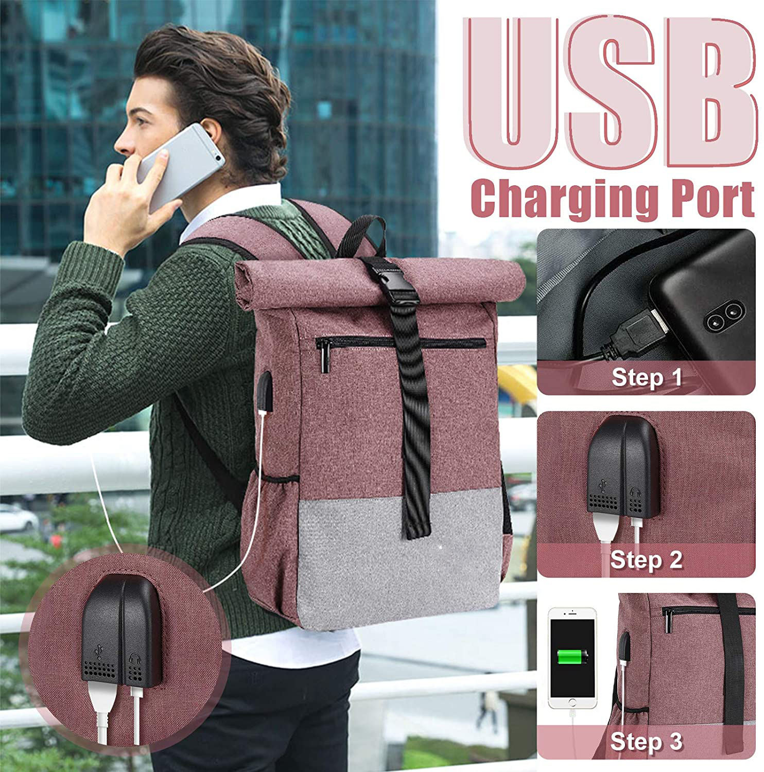 Lar / Produtos / Mochila / Mochila Enrolável / Mochila de viagem grande e leve, mochila escolar de negócios para laptop com porta de carregamento USB
