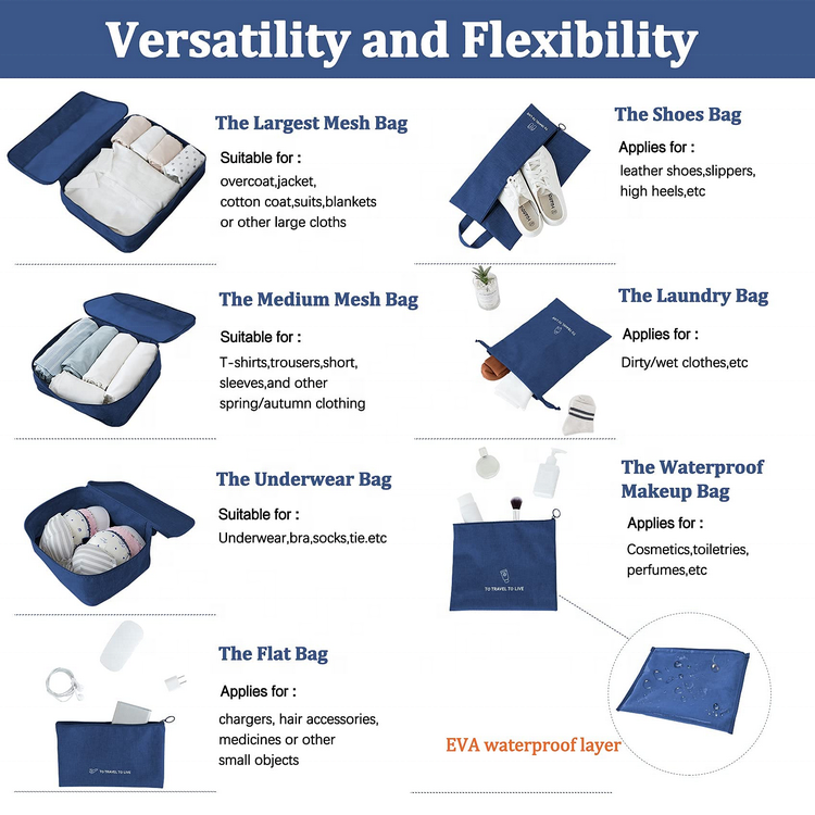 Lar / Produtos / Mala de viagem / Cubos de embalagem de viagem / Pacote organizador de viagens de alta qualidade 7 peças para sapatos de pano logotipo personalizado ao ar livre caminhadas acampamento viagem de negócios cubos de embalagem