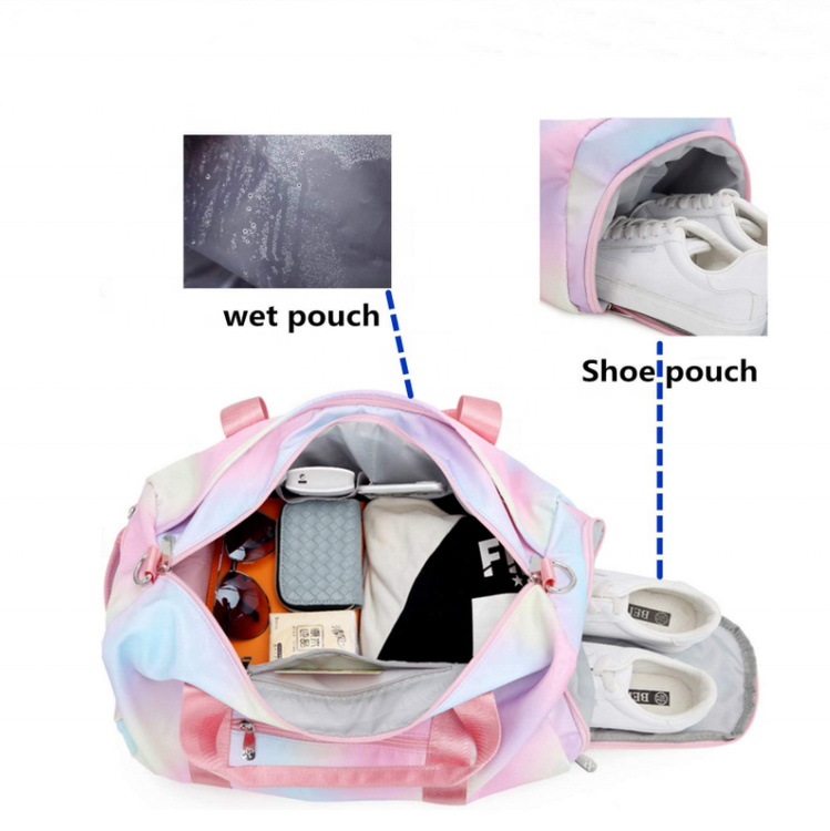 Lar / Produtos / Mala de viagem / Mochila / Portátil Custom Print Logo Weekend Overnight Luggage Shores Pocket Duffel Bag Colorida Rainbow Crossbody Bag Sport