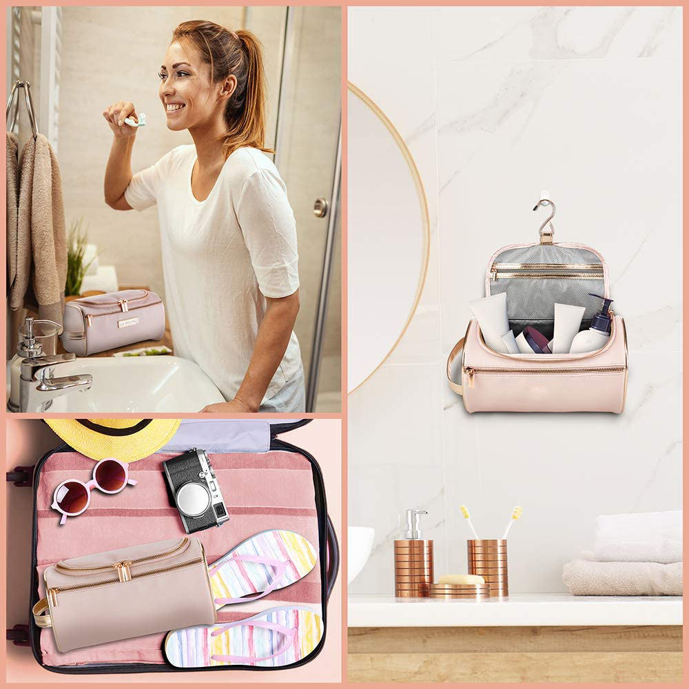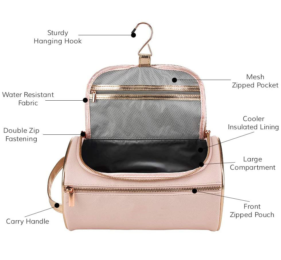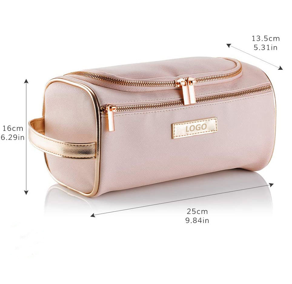 Lar / Produtos / Bolsa de cosméticos e produtos de higiene pessoal / Estojo de Higiene / Saco de higiene pessoal grande de couro rosa para pendurar, organizador de maquiagem de viagem, bolsa de cosméticos ouro rosa para mulheres, meninas