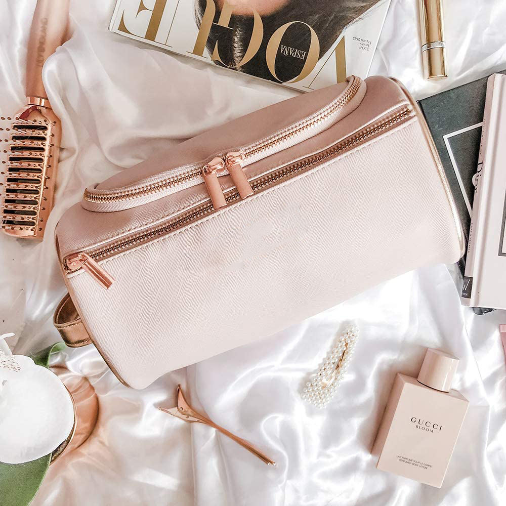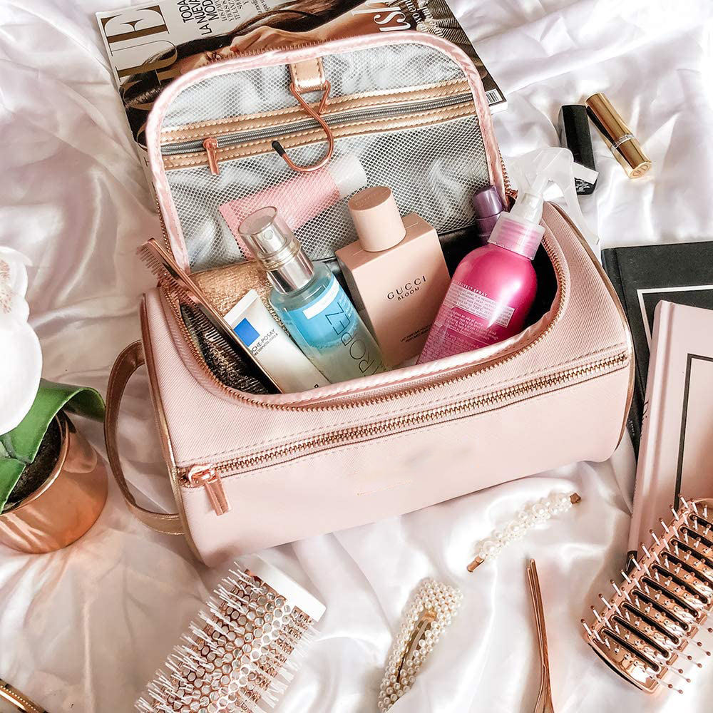 Saco de higiene pessoal grande de couro rosa para pendurar, organizador de maquiagem de viagem, bolsa de cosméticos ouro rosa para mulheres, meninas