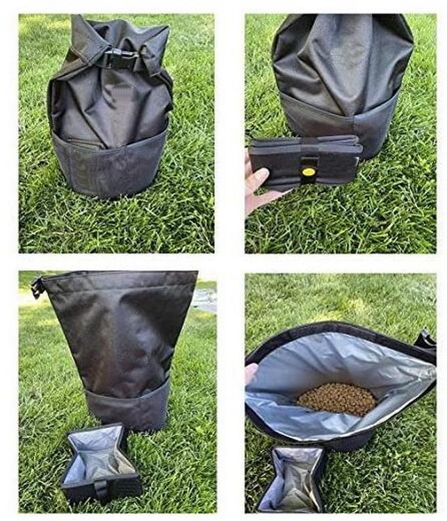 Lar / Produtos / Bolsa para animais de estimação / Saco portátil para transporte de comida Recipiente de armazenamento de lanche dobrável Saco de viagem para comida de cachorro com tigelas dobráveis