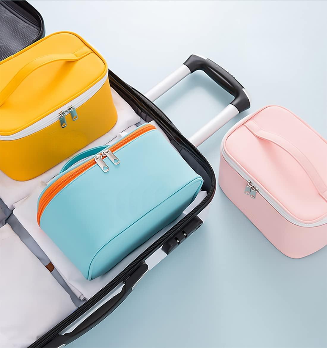 Bolsa de maquiagem com zíper de camada dupla amarela para viagem, couro PU, cosméticos, maquiagem, organizador de armazenamento para cuidados com a pele para mulheres
